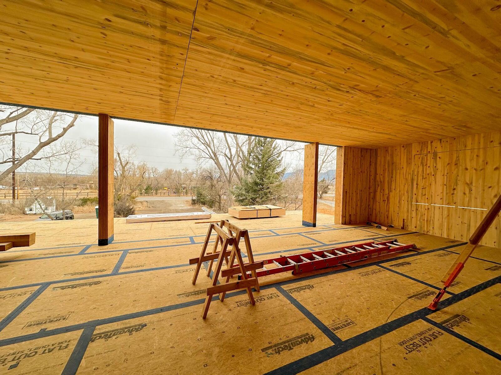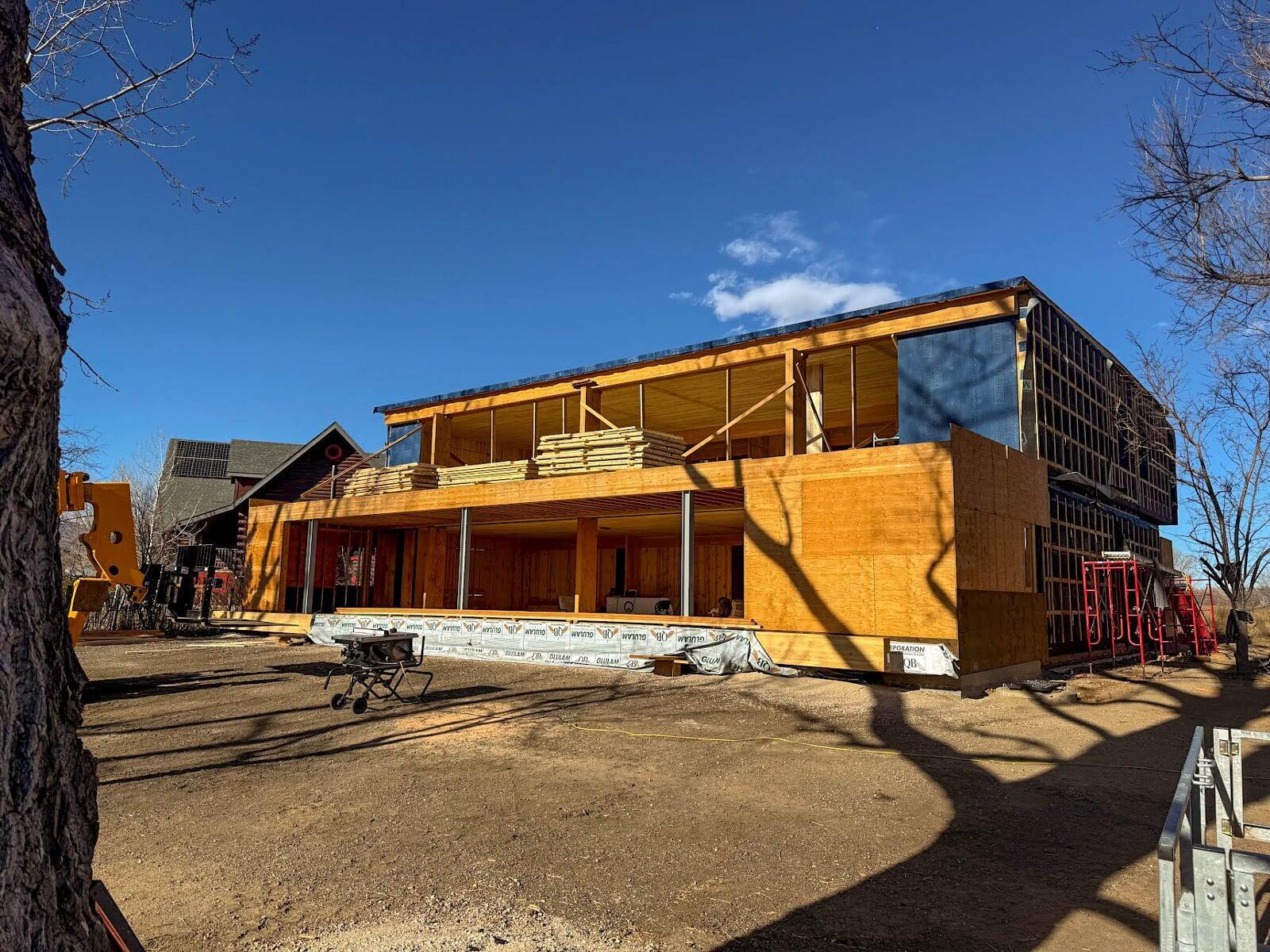 The owners of an organic farm partnered with Fuentes Design and Timber Age™ Systems to create a unique solution to workforce housing on a property outside Boulder, CO. The 5,500 square foot building provides two floors of private rooms paired with co-living spaces for farm workers utilizing a TAMBS insulated envelope paired with Ponderosa Pine CLT and traditional stick framed interior walls.